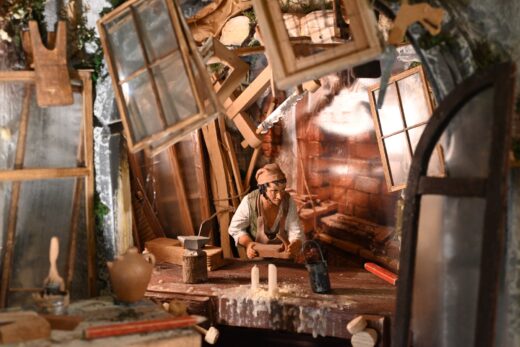 L’architettura e la struttura del presepe sono frutto di un paziente lavoro artigianale: intaglio e modellazione del polistirene, pitture a mano e un allestimento che ogni anno viene modificato e arricchito senza mai tradire l’impianto originario. Gli arredi in legno sono pezzi unici, realizzati nel tempo da appassionati artigiani e recuperati per il loro valore estetico e affettivo.