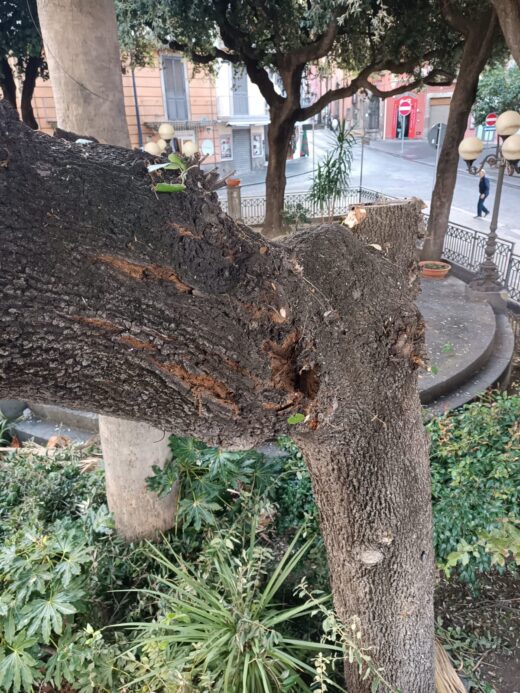 LE MOTIVAZIONI – Caiazzo poi va nel tecnico, sulla base dei referti stilati dagli esperti «Tali difetti, – prosegue – in associazione alle pregresse potature non sempre eseguite secondo corrette pratiche arboricolturali, hanno determinato un indebolimento generalizzato dell’apparato di sostegno della chioma, con incremento del rischio di cedimento di rami e branche, soprattutto in occasione di eventi meteorologici avversi (forti raffiche di vento, piogge intense, ) potendo costituire un potenziale pericolo per cose e persone, considerando che l’area in oggetto è una zona ad altissima frequentazione sia perché è un area centrale della città sia perché nei paraggi sono presenti molteplici attività commerciali si è proceduto ad abbassare la pericolosità. In particolare sull’esemplare con arbortag n° 5420 si è reso necessario un intervento di capitozzatura, poiché l’andamento dell’albero non era più di tipo verticale ma oramai era divenuto quasi orizzontale, riportando un difetto grave allo sviluppo della stessa. Oltre modo nella zona di diramazione tra il fusto e la branca era presente una macro fessura al cui interno si erano sviluppati marciumi dovuti alla presenza di funghi lignicoli, rendendo di fatto la branca molto debole e di conseguenza molto pericolosa per via di un eventuale schianto (di portata di circa 4-5 tonnellate), al suolo. Considerata che l’area in questione è un area ad alta frequentazione e non un aria marginale si è deciso di eliminare il pericolo per persone e cose procedendo con la capitozzatura e sanificazione della stessa. Al risveglio vegetativo la pianta avrà modo di poter sviluppare e far crescere nuove gemme e germogli che potranno divenire future branche con andamento regolare. In più in loco è presente una ceppaia che verrà rimossa e sarà piantata una nuova essenza di Leccio. Nel giro di pochi mesi vedremo un’ alberatura regolare, vegeta, in sicurezza ed esteticamente più bella.»