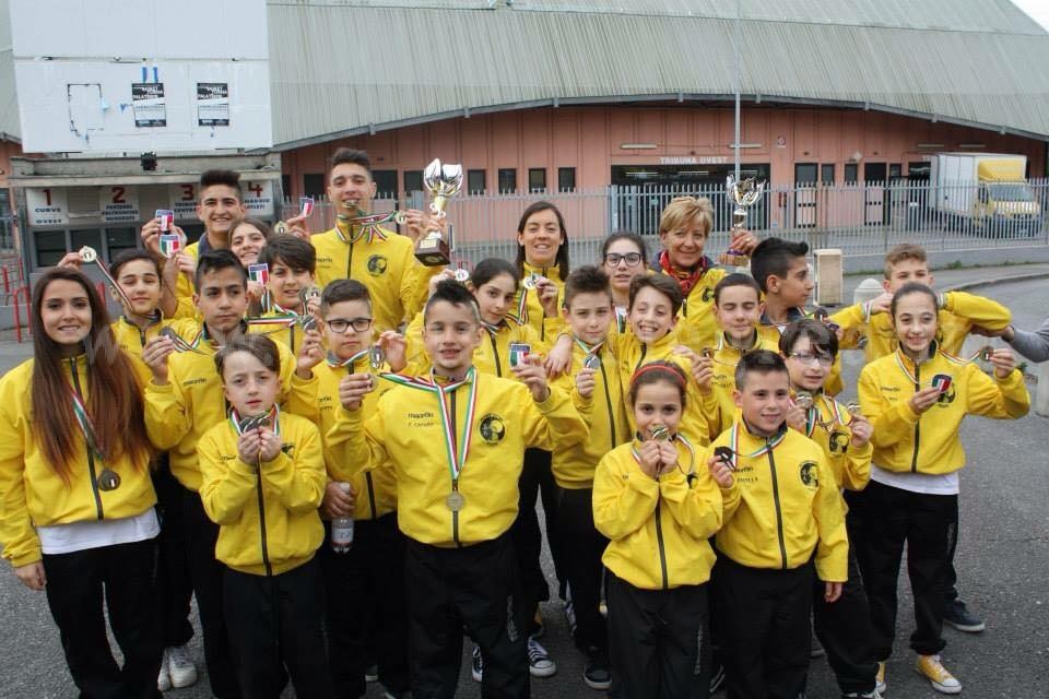 I SUCCESSI – Sono ben 11 i medagliati puteolani ai campionati nazionali. Alessia Del Vecchio (categoria arancio/verde – 35kg) torna a casa con 3 ori a squadre e due bronzi individuali. Antonio Marrandino che porta a casa un oro a squadre ed un argento individuale (categoria 9/10 anni). Flavia Bucciero che si aggiudica e ori a squadre ed un argento individuale (categoria arancio/verde -40kg). Francesco Pappagallo che vince un oro a squadre. Alessia Lucignano (categoria 14 anni arancio/verde) che conquista due bronzi individuali ed uno a squadre. Pietro Bellomo: bronzo individuale (categoria 11/12 anni bianca/gialla). Antonio Bellomo che vince un bronzo a squadre ed un argento individuale. Anna Cavaliere, argento a squadre. Benedetta Neri (categoria 11/12 anni) con un oro a squadre ed un bronzo individuale e Giulia Riccio che vince un oro individuale (categoria 9/10 anni bianca gialla – 35kg). Tra i tanti successi a squadre spiccano in particolare: oro Kata a Squadre cat.11/12 anni Open (Del Vecchio Alessia, Bucciero Flavia, Neri Benedetta), oro Kumite a Squadre Misto 9/10 anni Open di cintura e peso (Marrandino Antonio, Pappagallo Francesco, Del Vecchio Alessia) oro Kumite a Squadre Femminile 11/12 anni Open di cintura e peso (Del Vecchio Alessia, Pollio Francesca, Cavaliere Vittoria)