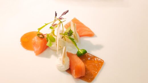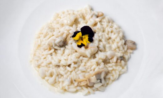Il Tagliolino Cantabrico e limone arriva per primo: acciughe del Cantabrico, burro, limone di Sorrento, caviale croccante. È un piatto delicato, bilanciato, luminoso. L’ingrediente trova spazio e armonia senza sovrapporsi. Il Risotto alla pescatora 2.0 chiude con una nota più profonda, marina, avvolgente. Un mare contemporaneo che riempie il palato, un sapore classico che riprende voce senza perdere eleganza. Anche qui il bianco è una scelta che lavora in sottrazione e precisione. E’ un bianco accompagna il classicismo del risotto senza appesantirlo, lasciando che siano la cremosità del riso e le sue sfumature avorio a parlare. Al centro una viola edibile interviene con un accento controllato che guida lo sguardo e dà profondità. Il risultato è un equilibrio delicato tra rigore e sensibilità
