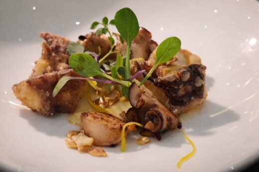 A firmare i restanti piatti è lo Chef de Cuisine Alessio Galati, la cui cucina accompagna l’esperienza verso una dimensione più mediterranea, fatta di materia, memoria e tecnica. L’Octopus Infusion è un piatto che racconta la storia del White Chill Out Lungomare, ormai parte del suo DNA. Il polpo, arrosto e fritto, gioca sulle consistenze con naturalezza. La patata liquida accoglie, la salsa ponzu dà tensione, il limone candito apre lo sguardo, le mandorle sabbiate chiudono con calore. È cucina che rassicura e coinvolge, piatto che si riconosce al primo assaggio. Con le Geometrie di salmone, il percorso si fa più intimo, giocando sull’equilibrio tra freschezza e sapidità. Il salmone bilanciato ai sali minerali incontra un disco solido di salsa ponzu, crème fraîche al limone e pane carasau. La composizione è pulita, il gusto scorre con naturalezza, il risultato è armonico e misurato. I Lupini in fiamme introducono una variazione più vivace: sauté di lupini, jalapeño, basilico, carbone vegetale e crostini. Un passaggio vivo, che risveglia il palato. L’Oro d’Islanda riporta tutto al Mediterraneo: baccalà fritto, crema di provola affumicata, friarielli al forte. Intenso, riconoscibile, diretto.