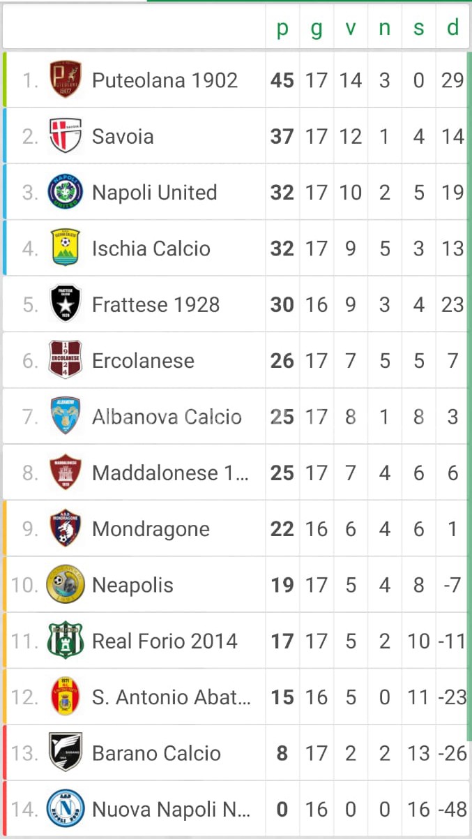 Puteolana: Maiellaro, Sica (61’ De Rosa), Amelio (46’ Petrarca), Rinaldi, Balzano, Marigliano, Grieco, Catinali (78’ Di Napoli), Di Lorenzo (61’ Gioielli), Di Giorgio (78’ Accietto), Guarracino. A disp.: Caparro, Porcaro, Viola, Accietto. All.: Marra