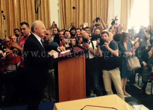 CAMPI FLEGREI – “Abbiamo vinto, buongiorno Campania”, così il primo, e anche un po’ frettoloso, tweet del Pd regionale annunciava la vittoria di Vincenzo De Luca. Il sindaco-sceriffo è il nuovo Governatore della Regione Campania. Dopo lo spoglio durato l’intera notte, il candidato del Pd, lascia indietro di 3 punti, l’uscente presidente Stefano Caldoro del Centrodestra. Dopo un testa a testa durato fino alle 5 del mattino, si è cominciata a divaricare la forbice tra i due. Su Facebook esaltazioni e messaggi di auguri dei deluchiani. De Luca chiude con 41,03% contro 38,32% su 5.659 sezioni scrutinate. Partito risultato vincitore il Movimento 5 Stelle con Valeria Ciarambino che chiude con 17,68%.