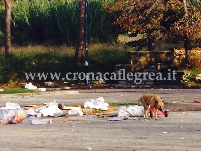 LO SCEMPIO – Un chilometro di strada impraticabile ricoperta da spazzatura. Queste le condizioni di Via Nicolardi che, a cadenza settimanale, ospita il famigerato mercatino di Monteruscello. La strada è già stata, più volte, al centro di polemiche per le condizioni in cui versa dopo le attività di vendita: sacchetti di spazzatura ed immondizia di ogni genere non lasciano spazio a null’altro. La situazione peggiore si presenta nel largo che abitualmente ospita il reparto alimentare dove si respirano odori nauseabondi ed i resti di alimenti attirano cani randagi, topi e insetti. Qui, infatti, come raccontano molti residenti, spesso si sono visti roditori rovistare tra i rifiuti.