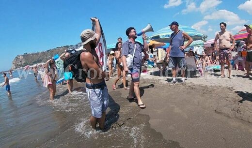 Megafoni, striscioni e panini con la mortadella: l’originale protesta sulle spiagge di Miliscola e Miseno