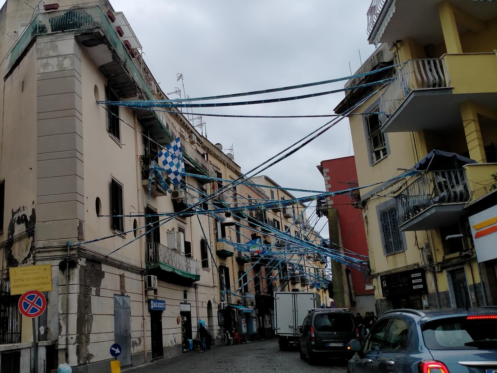 POZZUOLI – Continua a colorarsi di azzurro la città di Pozzuoli. Dal centro storico alle periferie aumenta l’entusiasmo per la marcia trionfale del Napoli che attende solo la matematica per cucire in petto il terzo scudetto della sua storia. Dopo il 4-0 rifilato al Torino, lungo via Roma sono stati montati decine di metri di festoni, palloncini e bandiere. La strada che dà l’accesso al centro storico si è completamente colorata di azzurro. Stesso entusiasmo anche a Monterusciello, dove da questa mattina il lotto 14 (nei pressi della stazione della cumana di Grotta del Sole) è completamente azzurro.
