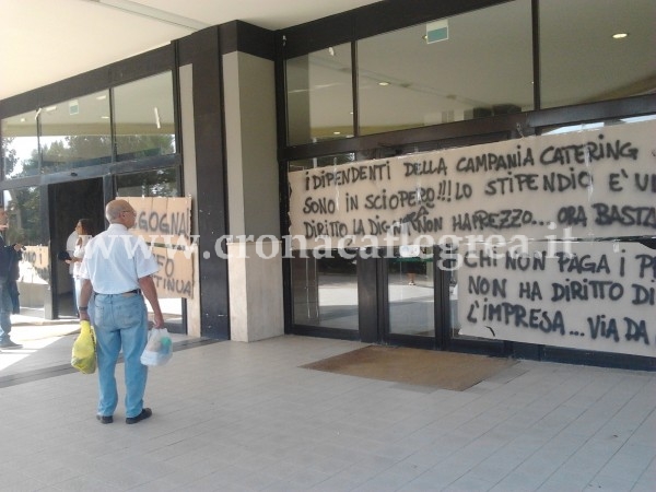 POZZUOLI– La disperazione li ha portati salire sul tetto dell’ospedale per protestare contro il mancato pagamento degli stipendi. Attendono ancora la quattordicesima, il mensile del mese scorso e temono che salti anche quello di ottobre. Il trend è negativo, lo si è capito da due anni a questa parte, da quando la “Campania Catering”, la ditta che si occupa del servizio mensa all’interno dell’ospedale “Santa Maria delle Grazie” di Pozzuoli ha iniziato a non rispettare le scadenze. “L’Azienda sanitaria non paga e noi non possiamo pagare i dipendenti” dicono da una parte “la nostra ditta riceve i soldi ma non ci versa gli stipendi” dicono dall’altra. In mezzo un rapporto di lavoro tribolato che si trascina da mesi tra scioperi e proteste. L’ultima ieri mattina, quando i 15 dipendenti della “Campania Catering” dopo aver affisso cartelli e striscioni all’ingresso del nosocomio flegreo hanno dato il via al sit-in di protesta.
