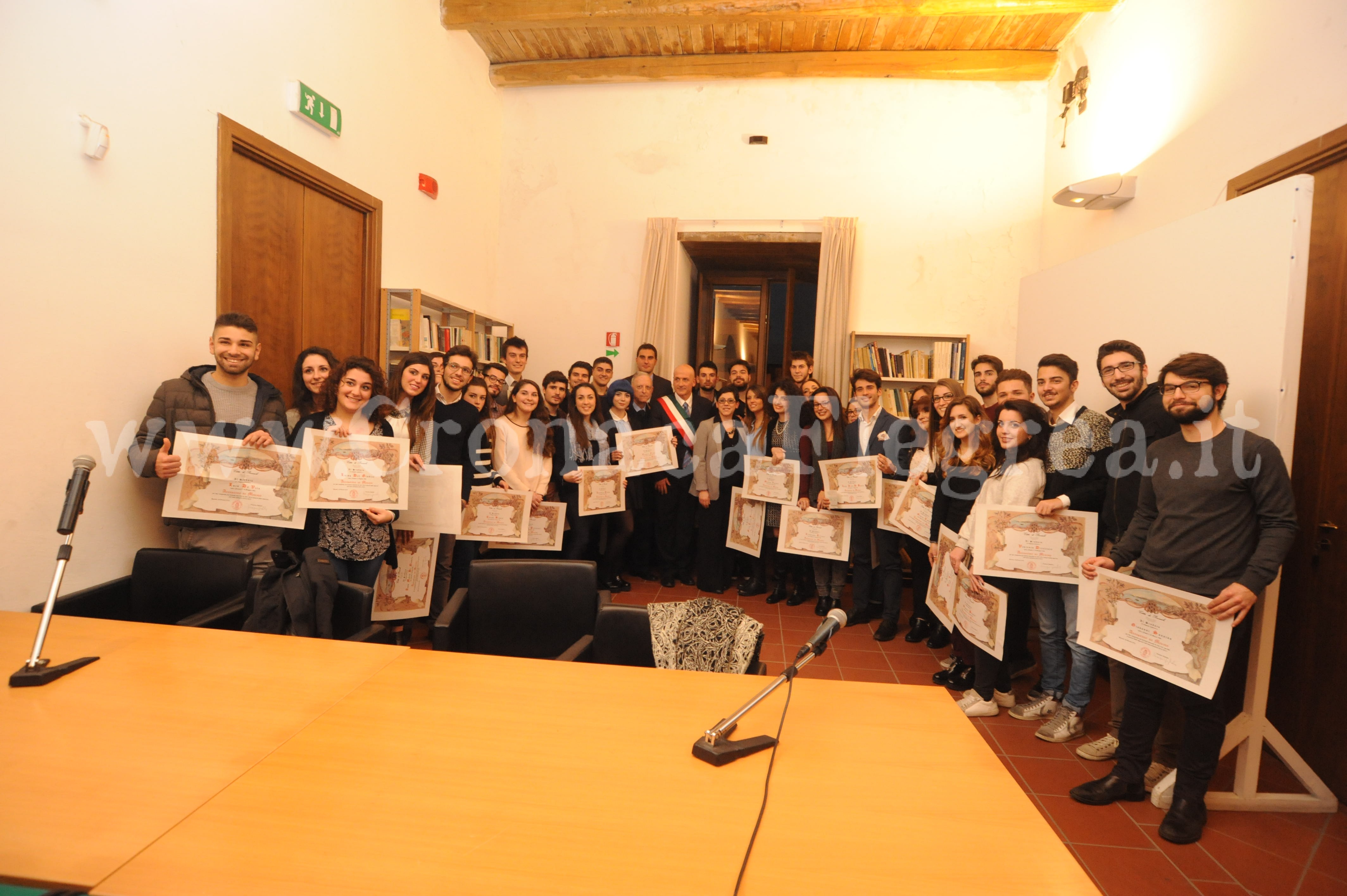 POZZUOLI – Il sindaco Vincenzo Figliolia e l’assessore alla Pubblica Istruzione Lydia De Simone hanno premiato ieri gli alunni puteolani che nel corso dell’anno scolastico 2014/2015 hanno conseguito la licenza di maturità negli Istituti Superiori con la votazione di 100/100. I giovani puteolani diplomati dagli Istituti Superiori sono 37 (16 allievi e 21 allieve), di cui 4 dell’Istituto Falcone, 3 del Tassinari, 7 del liceo Majorana, 6 del Pitagora, 2 dell’Istituto Pareto, 11 del Virgilio e 4 del Labriola. Il Sindaco ha rilasciato loro un attestato di merito per il brillante risultato conseguito negli studi. Gli studenti hanno ricevuto, inoltre, un assegno di euro 100,00; un gadget con lo stemma civico; una tessera valida per l’anno 2015 per accedere alla multisala Sofia di via Rosini (iniziativa resa possibile grazie alla disponibilità della direzione del cinema).
