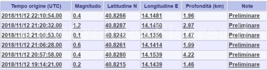 POZZUOLI – Uno sciame sismico, composto da sei scosse di magnitudo compresa tra 0,1 e 1.2, è stato registrato, nella serata di ieri, dai sismografi dell’Osservatorio Vesuviano. L’evento più forte, accompagnato dal solito boato, è stato avvertito da molti residenti della parte alta della città; si è verificato alle 22:20, con epicentro in zona Solfatara-Pisciarelli ad una profondità di circa 3 Km. Anche gli epicentri delle altre scosse sono localizzati nella stessa area con profondità compresa tra 1,46 e 4,22 Km. Dall’Osservatorio Vesuviano fanno sapere che si tratta di eventi legati alla normale attività della caldera flegrea.