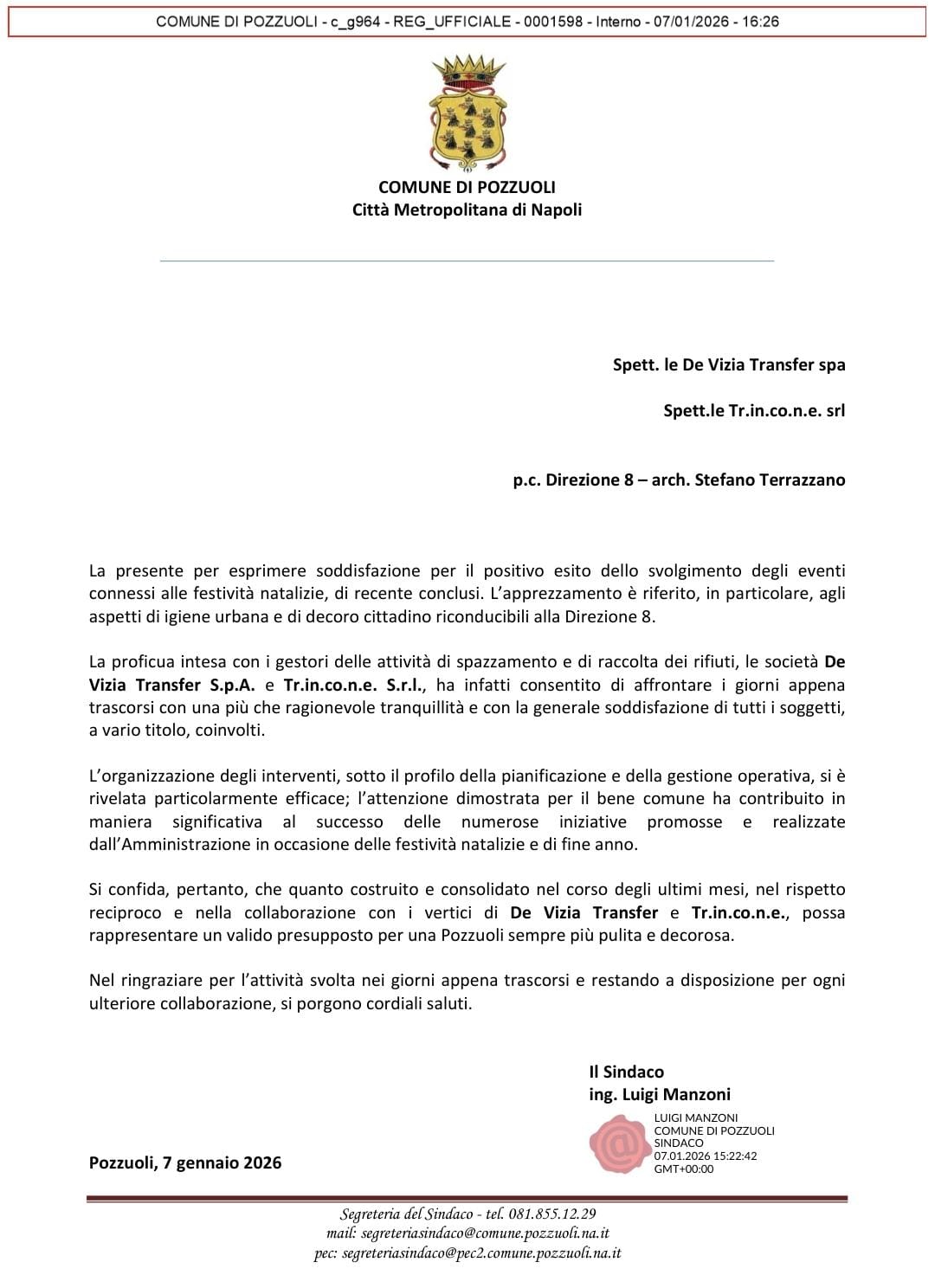 POZZUOLI – Spero vivamente che questo documento sia un falso o uno scherzo di pessimo gusto. Circola un encomio firmato dal Sindaco Manzoni (prot. 0001598 del 07/01/2026) in cui si parla di “soddisfazione”, “decoro” e “gestione efficace” per lodare De Vizia e Tr.in.co.ne. di Licola dopo le feste natalizie. Ma in quale città vive il Sindaco? Perché i dati e la storia recente di Pozzuoli raccontano un’altra verità.