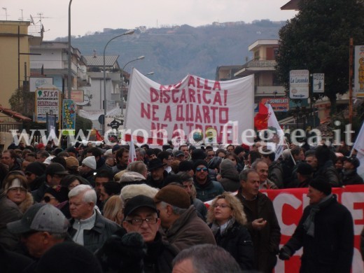 QUARTO/POZZUOLI – In tremila hanno sfilato oggi per dire “No” all’apertura di una discarica la Castagnaro, area al confine tra i comuni di Pozzuoli e Quarto. Cittadini di ogni età, associazioni, comitati, politici, residenti dei comuni di tutta l’area flegrea che partiti dalla Villa Comunale “Giovanni Paolo II” di Quarto hanno sfilato per le strade della cittadina di Quarto, in un corteo pacifico scortato senza problemi da carabinieri e polizia e conclusosi nell’area della cava. Nell’area del Castagnaro, dove sorgono le due cave secondo gli intendimenti della Regione Campania sarebbe prevista quella che tecnicamente viene definita ricomposizione ambientale o rimodellamento di cave dismesse nella quale dovrebbe poi finire il FUT, cioè la frazione umida tritovagliata stabilizzata. Operazione che qualora dovesse andare in porto, richiederebbe prima un intervento di rimodellamento del costone, operazione questa ritenuta particolarmente dispendiosa.