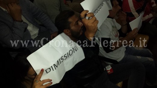 CONSIGLIO “INFUOCATO” – Le polemiche, come detto, sono approdate anche in aula, dove il consigliere Rossi non ha esitato a ripetere le accuse al sindaco già rivolte poche ore prima: «Il suo è un atteggiamento camorristico, si deve dimettere. E risponda, almeno». La fascia tricolore, invece, non ha voluto assolutamente intervenire, rimanendo in silenzio assoluto per l’intero svolgimento dei lavori. La bagarre che ne è nata ha anche costretto il presidente del consiglio comunale, Lorenzo Paparone, ha sospendere la seduta per due volte. Intanto, tra il pubblico, spuntavano cartelli con le scritte “dimissioni” e “vergogna”. Carabinieri e polizia municipale li hanno sequestrati, ma il clima è rimasto incandescente. Una seduta dal clima surreale, con il consigliere Rossi che ha continuato ad urlare le sue ragioni e dando vita ad un pesante battibecco con lo stesso presidente durante la sospensione dei lavori, e a microfoni ancora accesi.
