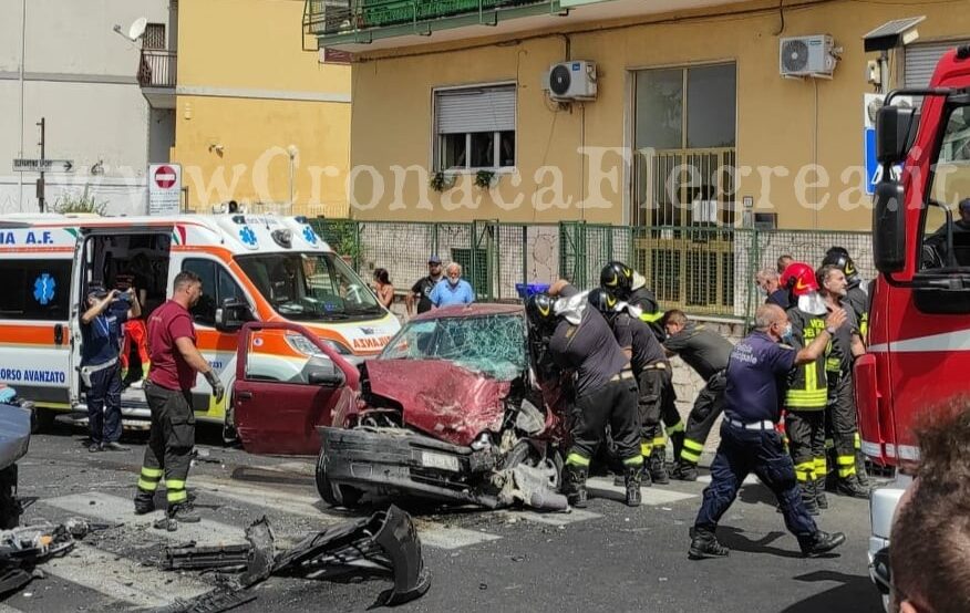 POZZUOLI – Uno spaventoso incidente stradale è avvenuto poco dopo le 11 di questa mattina in via Solfatara, davanti al parco Di Bonito. Il bilancio conta 5 feriti: due bambine, che sono stai trasportati all’ospedale “Santobono” di Napoli; i loro genitori, la madre trasferita al ponto soccorso del “San Paolo” di Fuorigrotta e il padre al “Santa Maria delle Grazie” di Pozzuoli; e un 21enne extracomunitario, le cui condizioni sono apparse dal primo momento estremamente gravi. Per estrarlo dall’abitacolo è stato necessario l’intervento dei vigili del fuoco che hanno dovuto rimuovere le lamiere. Il giovane è stato trasferito in codice rosso all’ospedale di Pozzuoli. Non preoccupano, invece, gli altri quattro.