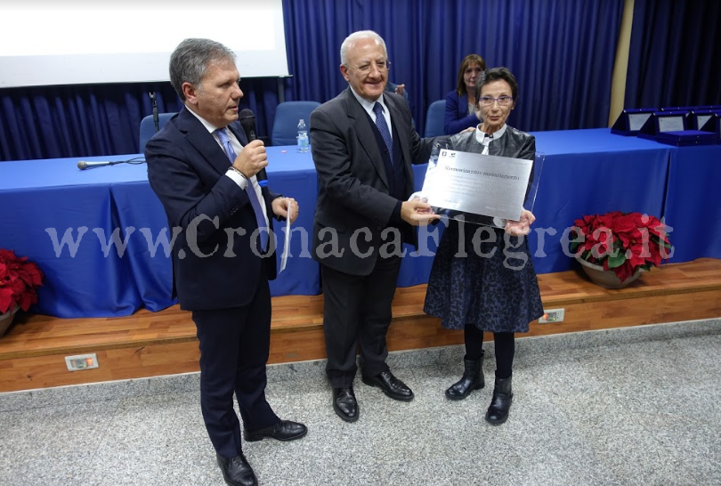 LA PREMIAZIONE – Il Presidente della Giunta Regionale della Campania Vincenzo De Luca e il Direttore Generale dell’ASL Napoli 2 Nord Antonio d’Amore hanno consegnato riconoscimenti al personale dell’Azienda Sanitaria nell’ambito del premio “collega esemplare” istituito dalla Direzione dell’ASL. I premi, diretti a tutto il personale dipendente non dirigenziale dell’ASL Napoli 2 Nord, sono stati assegnati in base alle segnalazioni dei colleghi e a verifiche effettuata dalla Direzione aziendale. La cerimonia di premiazione è stata presenziata dal Direttore Sanitario dell’ASL Napoli 2 Nord Virginia Scafarto e dal Direttore Amministrativo dell’ASL Napoli 2 Nord Francesco Balivo. L’evento si è svolto a Frattamagiore presso la Sala convegni dell’azienda Sanitaria, in via Padre Mario Vergara 228.